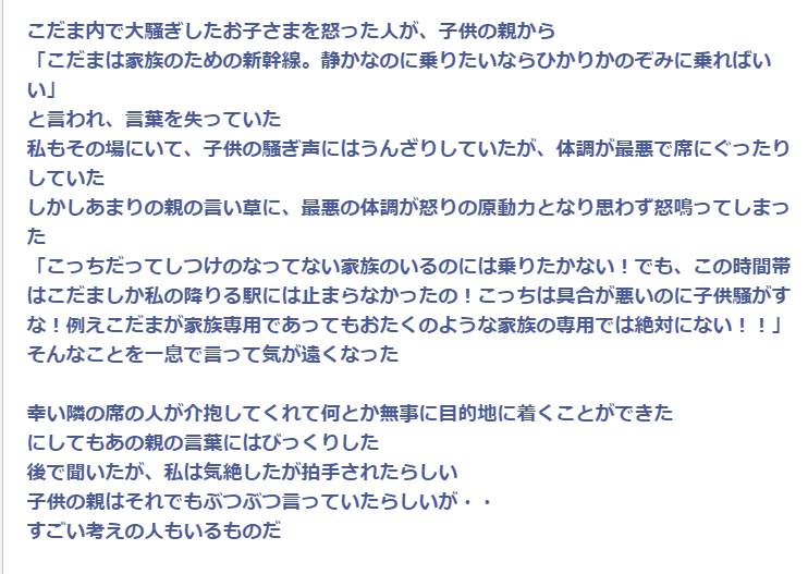 【えっ、そうなの!?】新幹線でお子様が大暴れしてたので誰かが叱った。するとその子の親「こだまは家族のための新幹線。静かなのに乗りたいならひかりかのぞみに乗ればいい」→