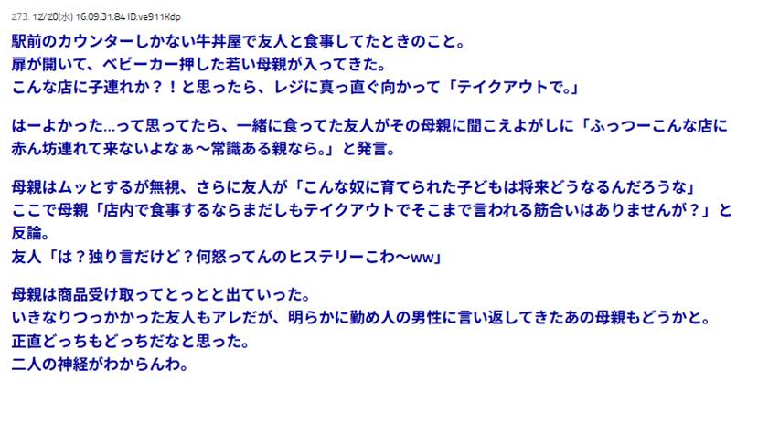ベビーカーを押した若いママさんが牛丼屋に入店した。 俺(え?こんな店に子連れか?)母親「テイクアウトで」俺(よかったー)友人「常識ある親ならふっつーこんな店に赤ん坊連れてこないよな」俺(言った~!) → するとママさんは……