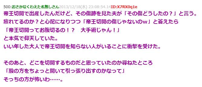 私の帝王切開の痕を見て旦那が「その傷、どうしたの?」と聞いてきた。なにいってだこいつ。帝王切開知らんのか。どんな手術かと教えたらビックリ仰天して…