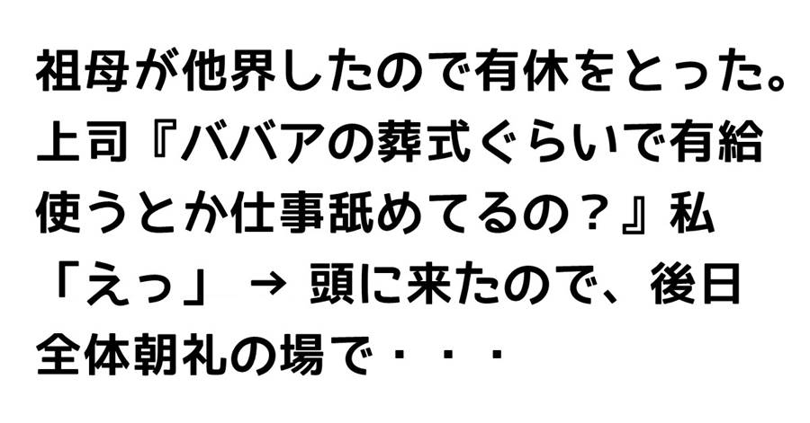 祖母が他界したので有休をとった。上司『ババアの葬式ぐらいで有給使うとか仕事舐めてるの?』私「えっ」 → 頭に来たので、後日全体朝礼の場で・・・