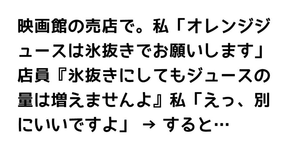 映画館の売店で。私「オレンジジュースは氷抜きでお願いします」店員『氷抜きにしてもジュースの量は増えませんよ』私「えっ、別にいいですよ」 → すると…