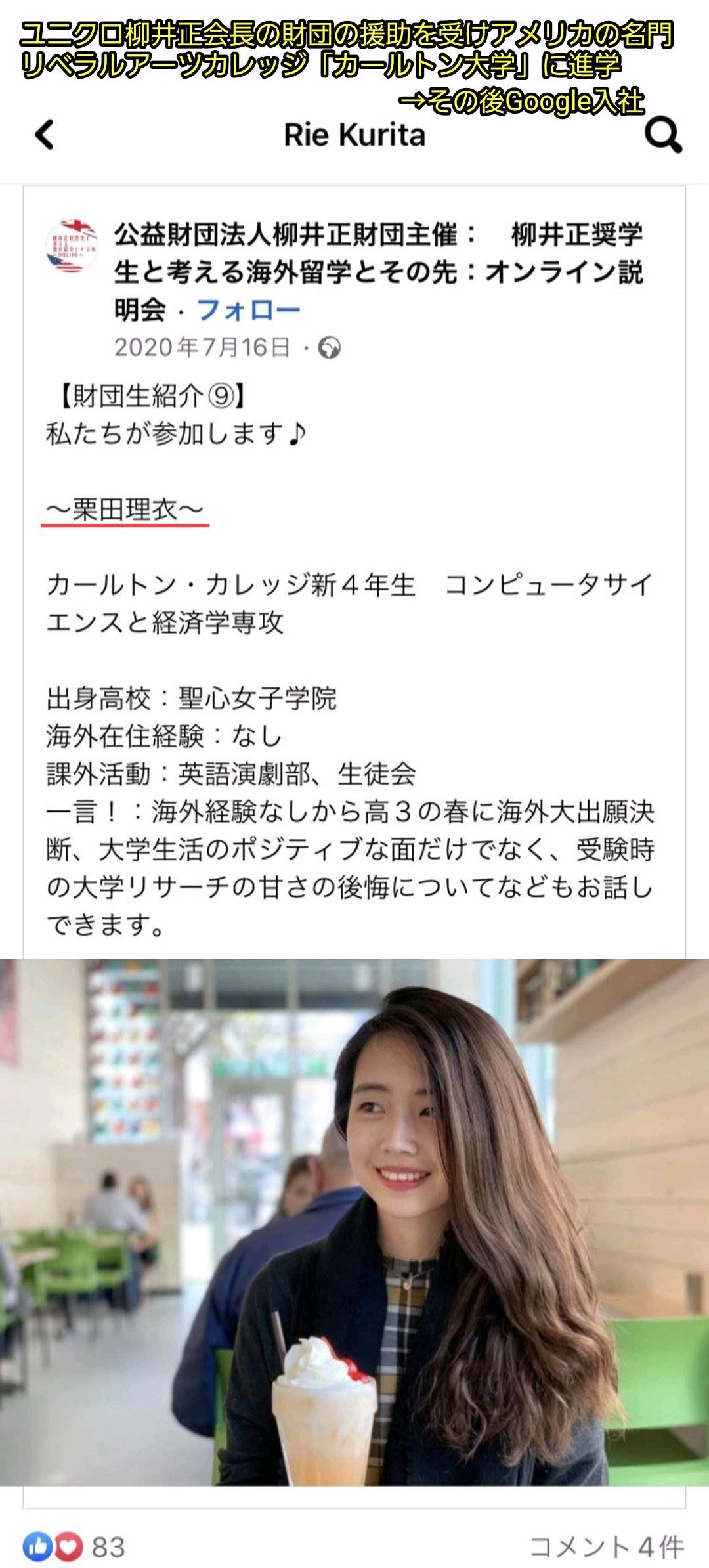 日本人女性さん、ユニクロ柳井会長の財団援助を受けアメリカの名門大に進学