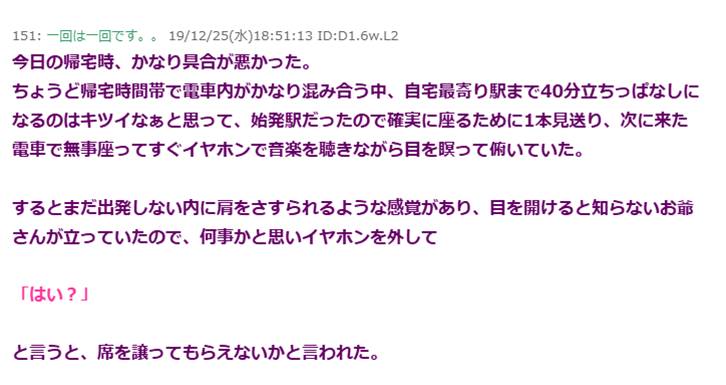 電車で座っていると、お爺さん「席を譲ってもらえないか?」→ かなり具合が悪かったので、その事を伝えた。するとお爺さんは・・・