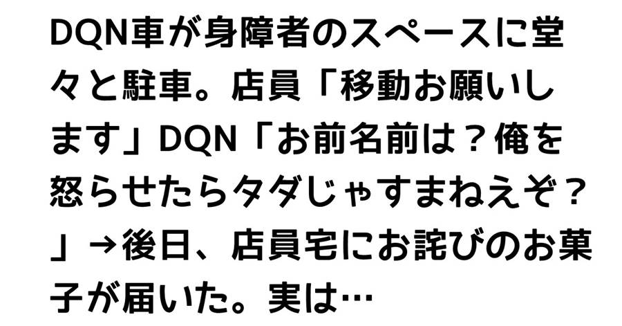 DQN車が身障者のスペースに堂々と駐車。店員「移動お願いします」DQN「お前名前は?俺を怒らせたらタダじゃすまねえぞ?」→後日、店員宅にお詫びのお菓子が届いた。実は…