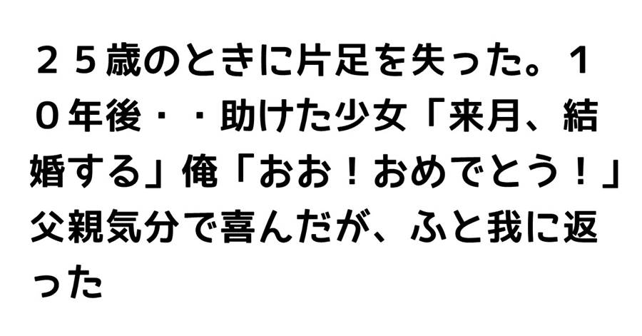 25歳のときに片足を失った。10年後・・助けた少女「来月、結婚する」俺「おお!おめでとう!」父親気分で喜んだが、ふと我に返った
