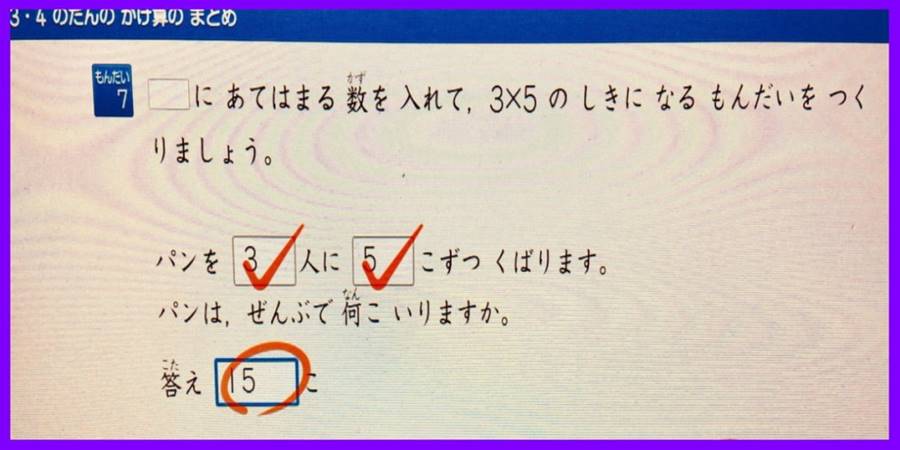 【大炎上】問題「3×5になる式を作りましょう」小学生「パンを3人に5個ずつ配る」先生「ダメです」