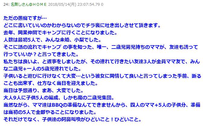 【阿鼻叫喚】未婚仲間でキャンプに行くことに。子持ちママ「私も参加したい!友達も誘っていい?」私達「OK」→ヤバいことに…