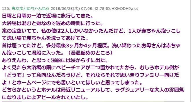 旅行先の大浴場で生後3,4ヶ月程度の赤ちゃんを湯船に入れてる人がいた。私は「ありえんわ!」と思って湯船に浸からずに出た。普通オムツが取れてから入れるもんでしょ?