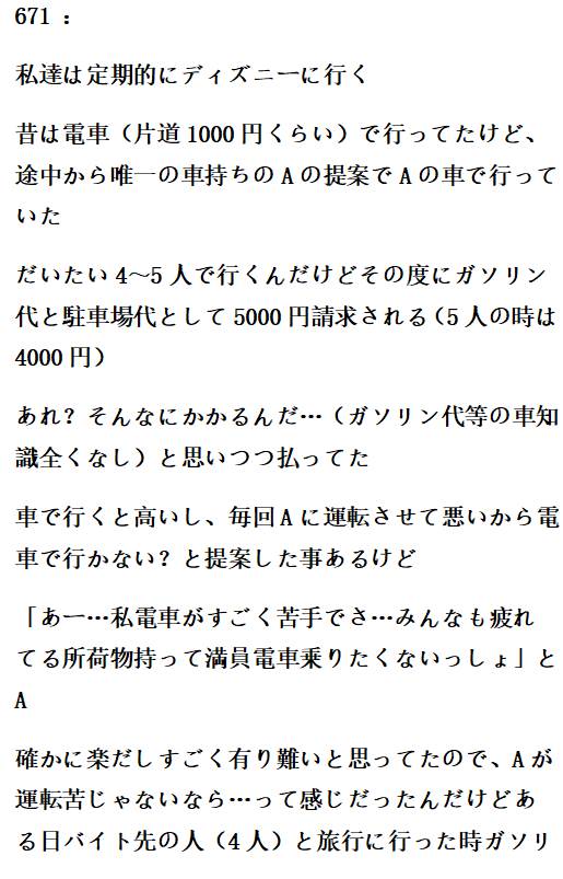 私達は友人4~5人で定期的にディズニーに行く。A「車出すよ。ガソリン代1人円ね」私(車ってお金かかるんだ…)ある日、バイト先の人と話したら…