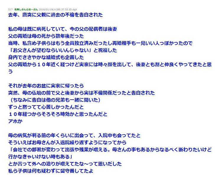 母が他界して数年後、父が再婚した → 10年後、父が突然母の仏壇の前で『今嫁とはフリン関係だった。ずっと黙ってて心苦しかった』と告白して…