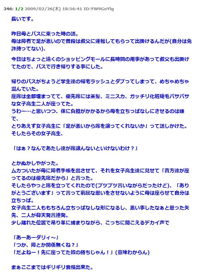 バスの中で、私「足が悪いから席を譲ってくれない?」優先座席の女子高校生『なんであたし達が席譲んないといけないわけ』障者手帳を見せる母→その後トンデモないことに