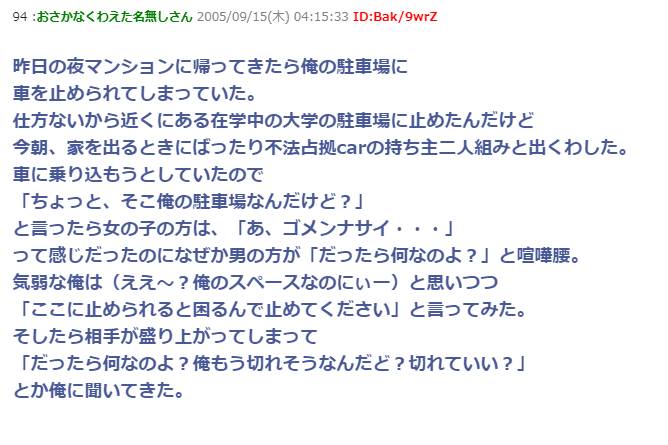 【武勇伝?】不法占拠してた車の持ち主と出くわした。俺「そこ、俺の駐車場なんだけど?」女「ゴメンナサイ...」男「だったら何?俺、キレていい?」俺「え?(;゚Д゚)」→結果