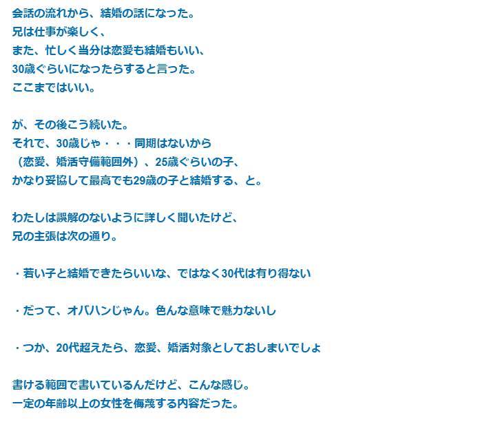 兄(25)「30歳位になったら、25歳位の女と結婚する。30代のババアとかムリだから」私「自分も年取るんだよ?相手も永遠に20代じゃないし」兄「」→結果…