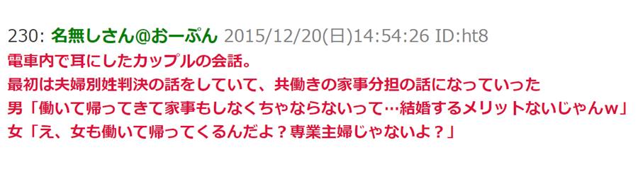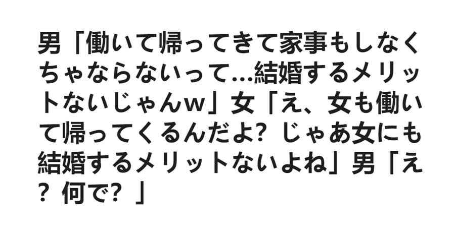 男「働いて帰ってきて家事もしなくちゃならないって…結婚するメリットないじゃんw」女「え、女も働いて帰ってくるんだよ?じゃあ女にも結婚するメリットないよね」男「え?何で?」