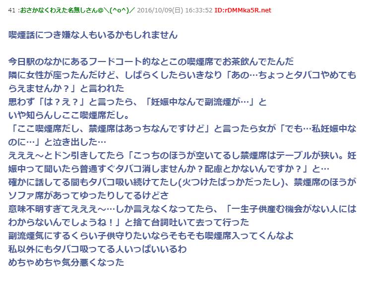 喫煙席でタバコ吸ってたら妊婦がやってきて「タバコ止めてください!」ここは喫煙席だし禁煙席はあっちだと正論を言うと泣きだして→妊婦様の謎思考にドン引き…
