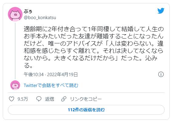 2年付き合って1年同棲して人生のお手本みたいだった友人が離婚。→そんな友人からの唯一のアドバイスが・・・沁みる。。