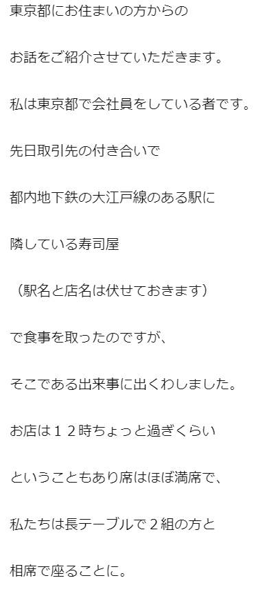 理不尽な理由で老夫婦の客をバカにする寿司屋の大将。それを見た隣の若いカップルは店主に言及。その言葉は今どきの若者では珍しい粋な内容だった。