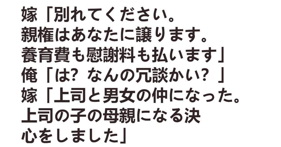嫁「別れてください。親権はあなたに譲ります。養育費も慰謝料も払います」俺「は?なんの冗談かい?」嫁「上司と男女の仲になった。上司の子の母親になる決心をしました」