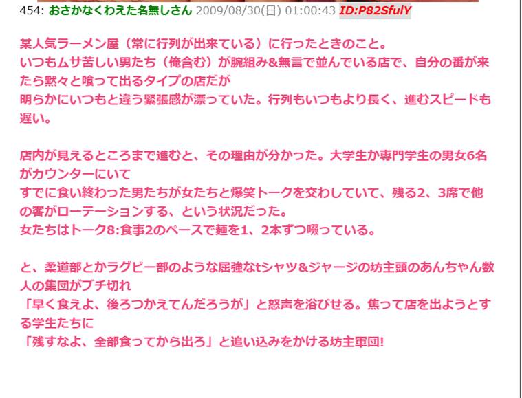行列ができるラーメン屋で、場違いな男女6人が「キャッキャ」と食べていた。他の客全員で怒声を浴びせてたら、女がラーメンを吐いて・・・