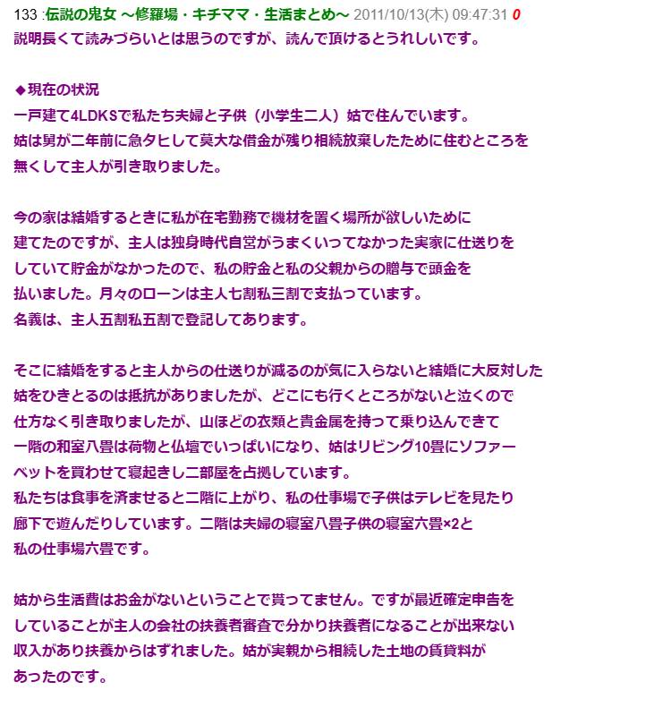 戸建に私達家族と住む所のない姑を引取り同居している。自宅名義は夫と私の5:5で姑からの生活費はなし。義妹「里帰り出産する!」。姑に収入がある事が判明し