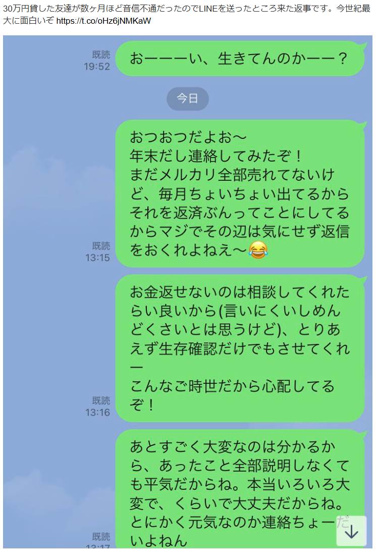 お金を貸した友達が数ヶ月ほど音信不通だったのでLINEを送ったところ来た返事がこちら…