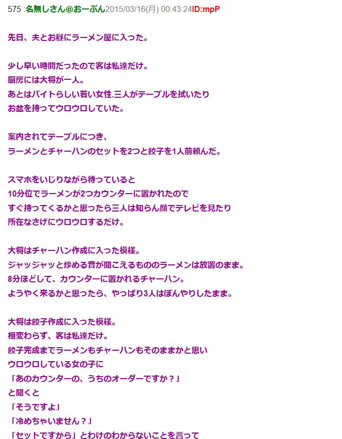 夫とラーメン屋に行って注文 10分くらいでカウンターに自分たちの分らしきラーメンが置かれるが店員は放置 → 店員に「あのカウンターの、うちのオーダーですか?」と聞くと…