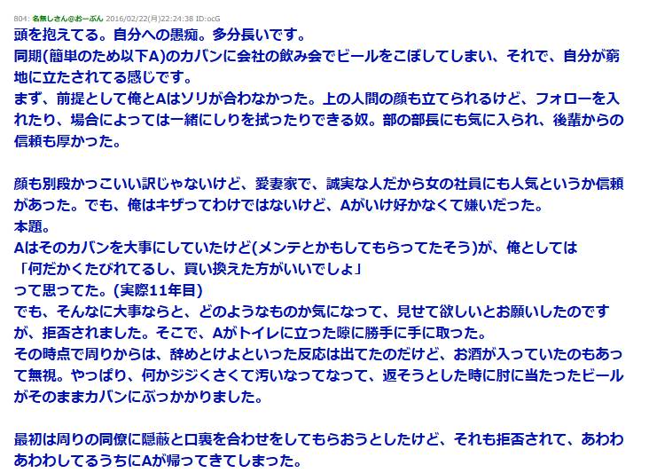 【報告者キチ】飲み会で。俺『1万円でいい?』A「…」同僚「1万で済む訳ないだろ!」→俺の不用意な行為でAのカバンにビールが掛かった→結果、俺に居場所は無くなった