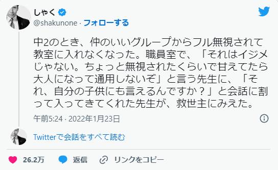 仲のいいグループから無視され悩んでいたら「それくらいで甘えるな」と言い放った教師。すると別の先生が・・・