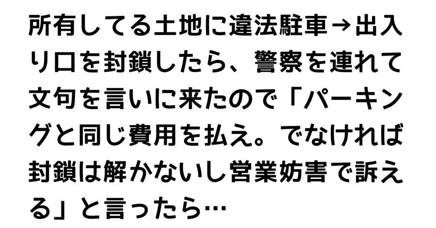 所有してる土地に違法駐車→出入り口を封鎖したら、警察を連れて文句を言いに来たので「パーキングと同じ費用を払え。でなければ封鎖は解かないし営業妨害で訴える」と言ったら…