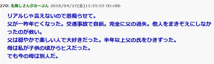父が事故で亡くなり、ヒスだった母が別人のように穏やかになっていった。私(嫌な感じだな) → ある日父の遺品を整理していると、私『これが理由か…』 → それが…
