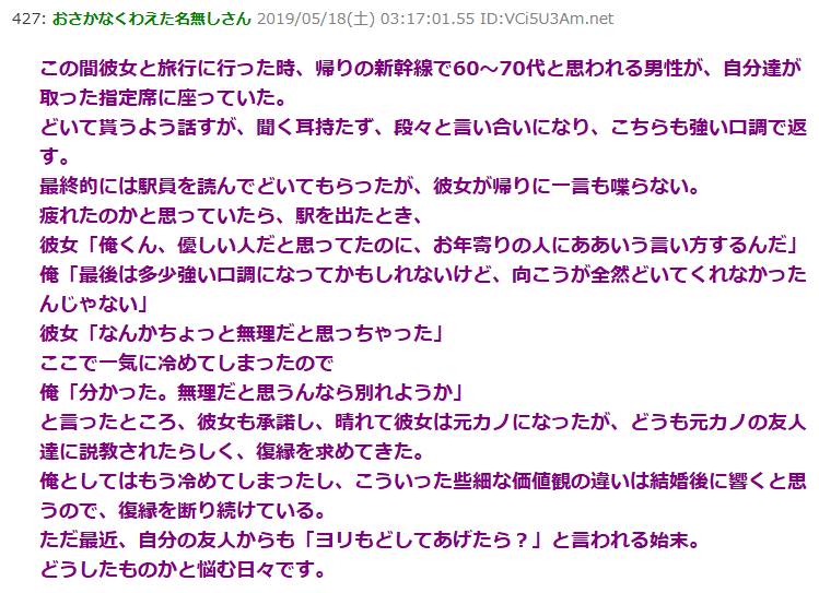 彼女と旅行に行った時、帰りの新幹線でおじさんが、自分達が取った指定席に座っていた。なかなかどいてくれず、駅員を呼んでどいてもらった。その後から彼女が一言も喋らな